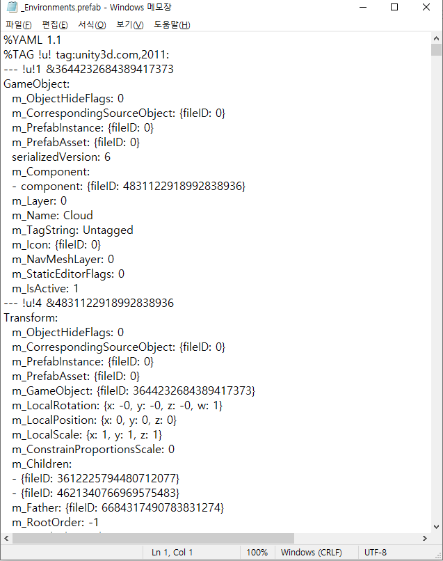 - 메모장을 통해 prefab 등의 파일을 열어볼경우, YAML 형태로 직렬화 되어있는것을 확인할 수 있음