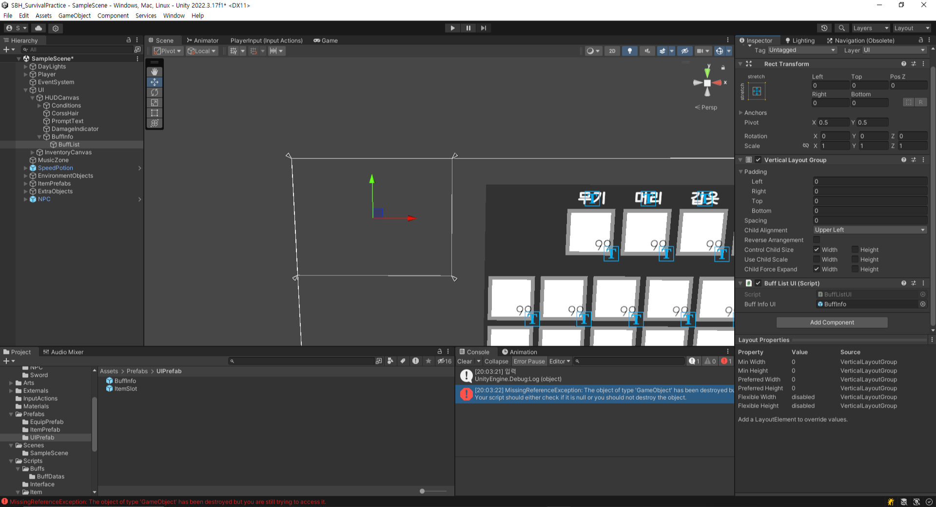 프리팹으로 빼두었던 버프시간 UI가 UI에 남아있던것을 확인하고 왜 오류가 발생하는지 알 수 있었습니다.