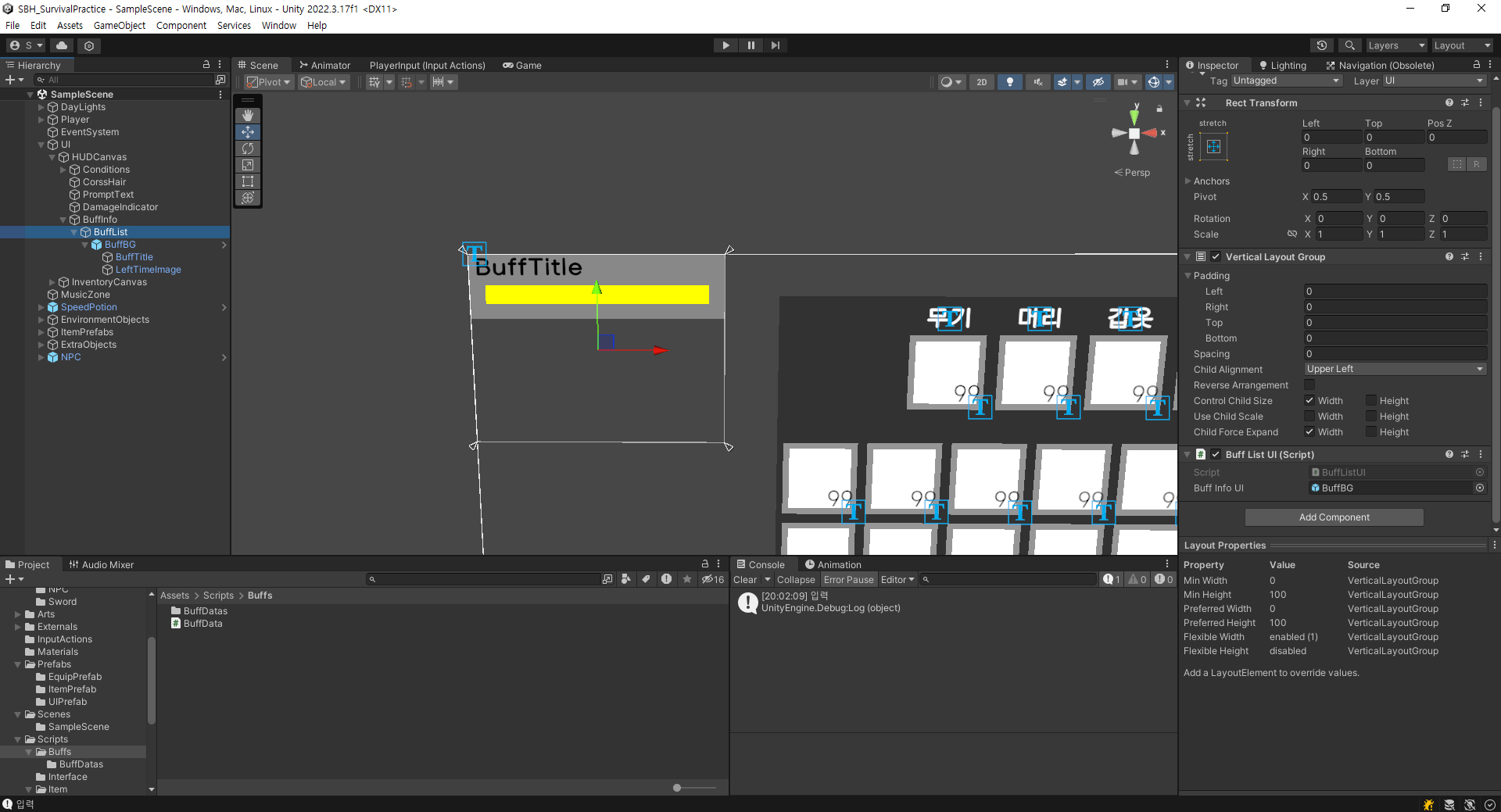 제가 작성한 버프 UI는 플레이어의 버프가 추가될경우 변수로 등록한 게임오브젝트를 생성하고, 시간이 지나면 UI는 자체 스크립트로 인해 파괴되는방식이였습니다.