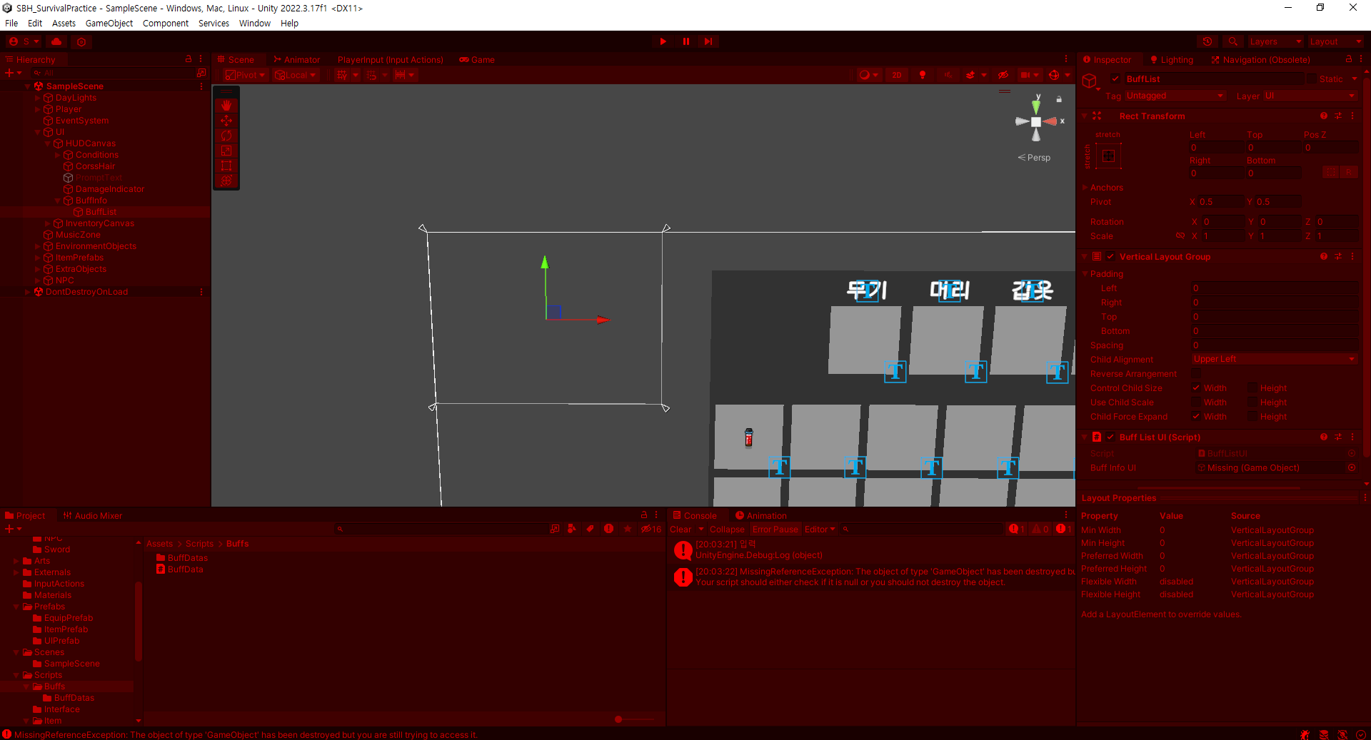 이 상태 그대로 실행하여 버프 아이템을 사용할경우, 이미 파괴된 게임오브젝트에 접근을 시도하였다는 내용의 오류가 발생합니다.