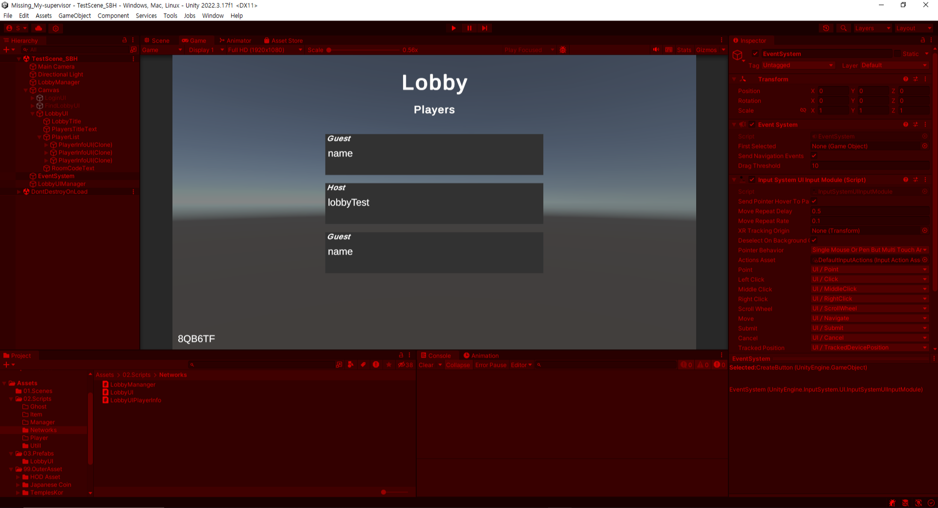 코드를 TMP_InputField 에 입력하고 버튼을 누르면 해당 코드를 가진 로비로 입장하게 됩니다.