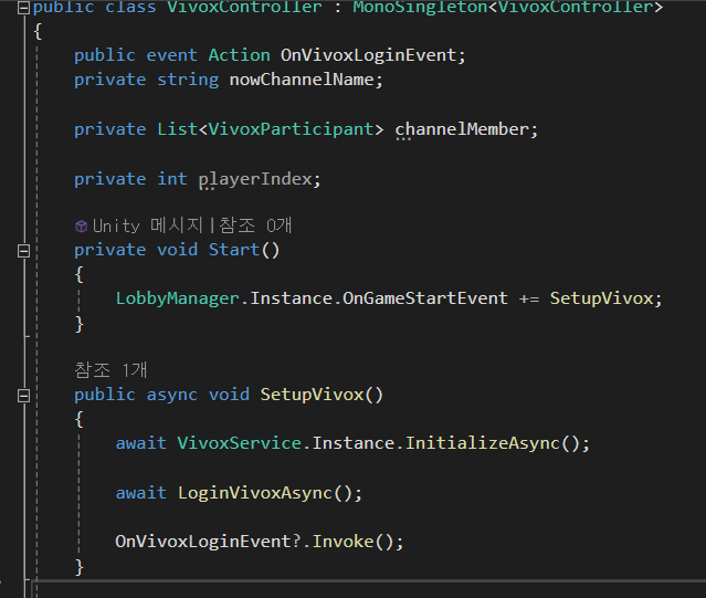 게임 시작 버튼을 누르면 이벤트를 통해 SetupVivox() 메서드가 작동하며, 비복스 서비스에 연결을 시도합니다.