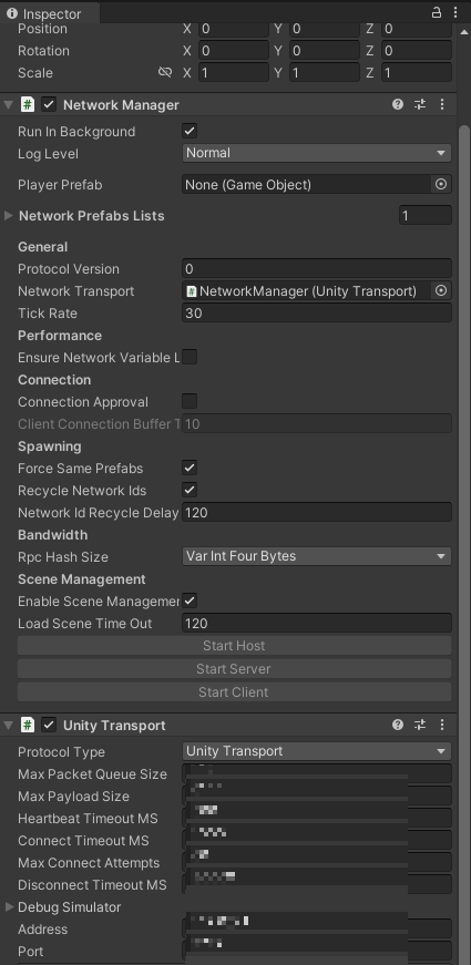 네트워크 매니저는 NetCode 에서 지원하며, Unity Transport 스크립트를 같이 가지고 있어야 작동합니다.