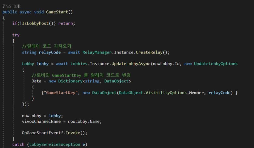 게스트의 경우 JoinRelay() 메서드를 통해 호스트의 릴레이 서버에 연결하며, 키는 로비 데이터의 GameStartKey를 통해 받아서 서버에 연결합니다.