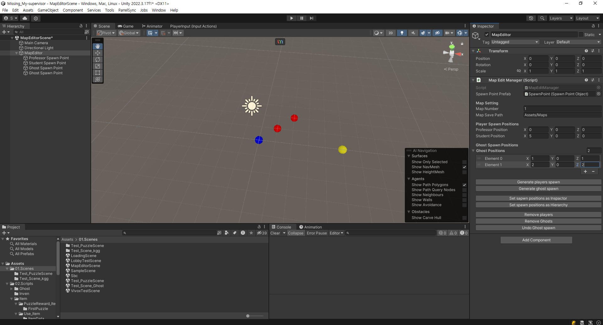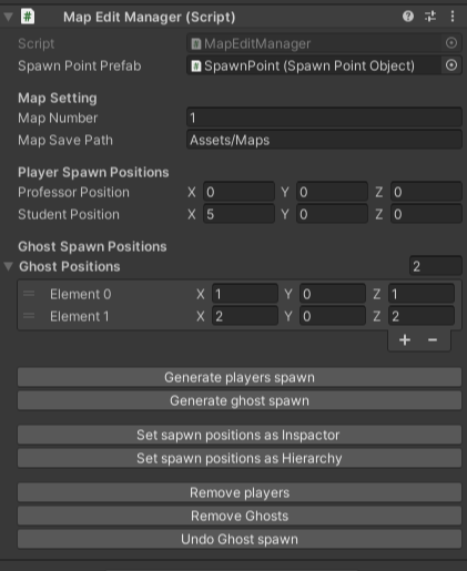 Generate players spawn 버튼으로 2명의 플레이어 스폰 위치를 생성 할 수 있으며, Generate ghost spawn 으로 유령이 스폰될 위치를 정해줄 수 있습니다.