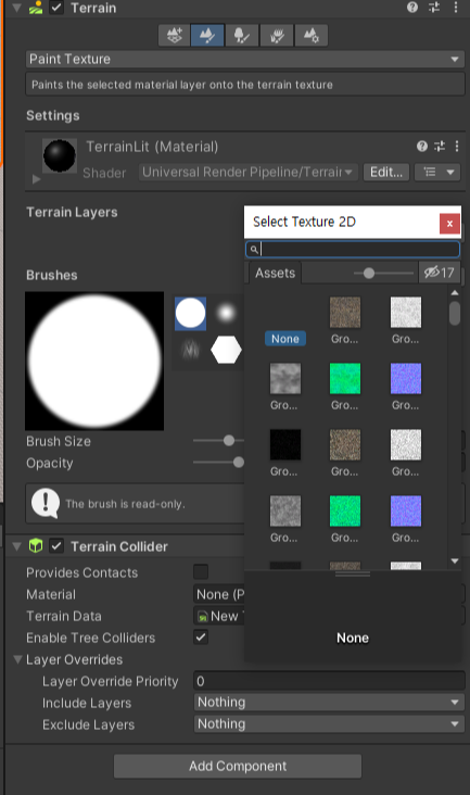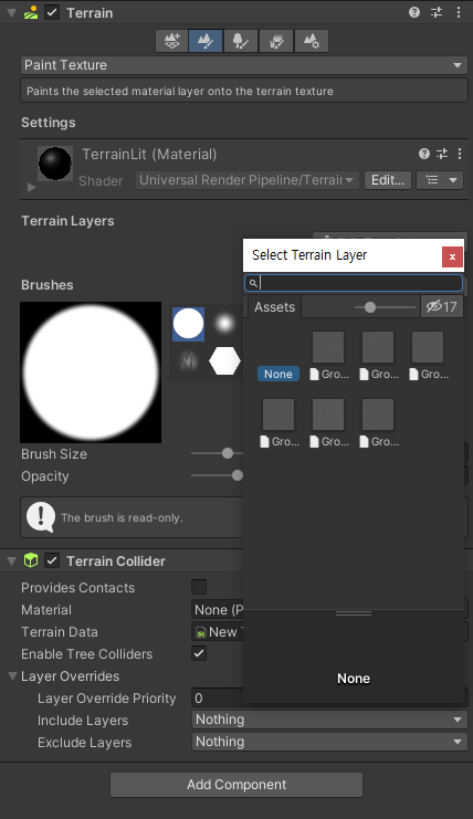 - 지형에 텍스쳐를 입힙니다. Add Layer로 추가로 받아준 Terrain Layer 를 사용하거나, Create Layer 로기존 텍스쳐를 Terrain Layer 로 만들어서 사용해야합니다.