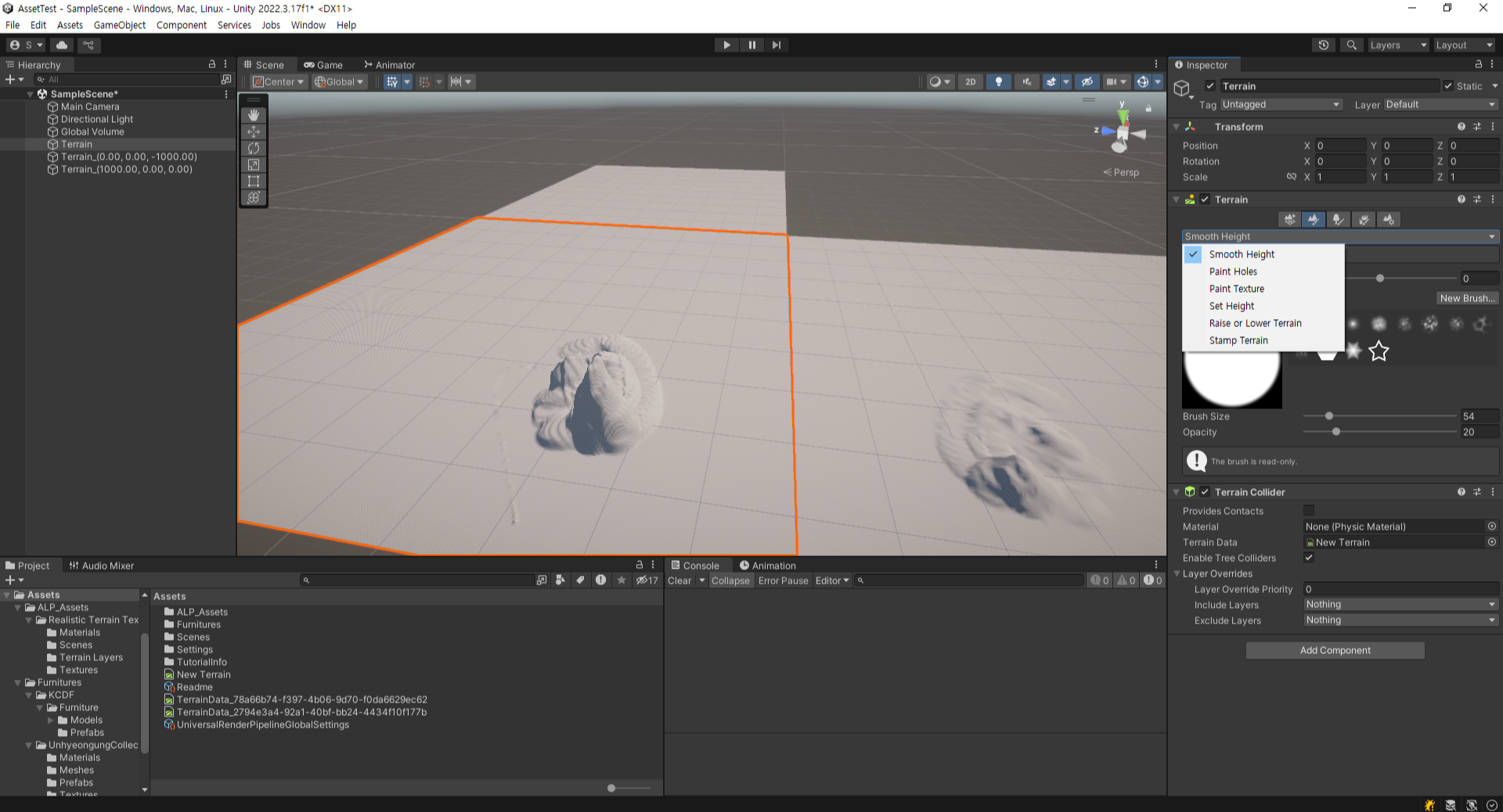여기에는 Smooth Height, Paint Holes, Paint Texture, Set Height, Raise or Lower Terrain, Stemp Terrain 을 선택하여 지형을 그리게됩니다.