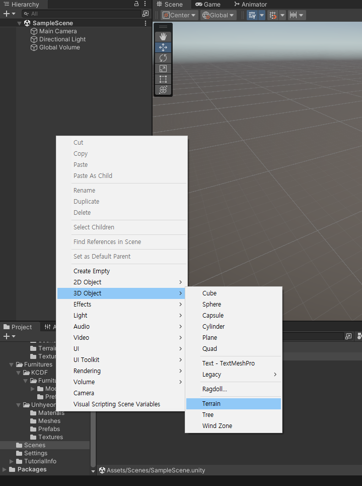 터레인의 경우, 하이라키창에서 우클릭 후, 3D Object - Terrain 을 선택하여 생성 할 수 있습니다.