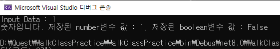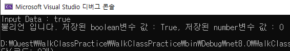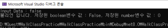 Console.WriteLine($"불리언 입니다. 저장된 boolean변수 값 : {boolean}, 저장된 number변수 값 : {number}");