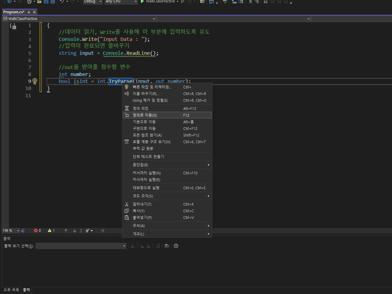TryParse문의 정의를 확인해보도록 하겠습니다. 원하는 함수에 드래그를 한 후, 우클릭을 통해 해당 함수가 정의된 스크립트로 넘어갈 수 있습니다.