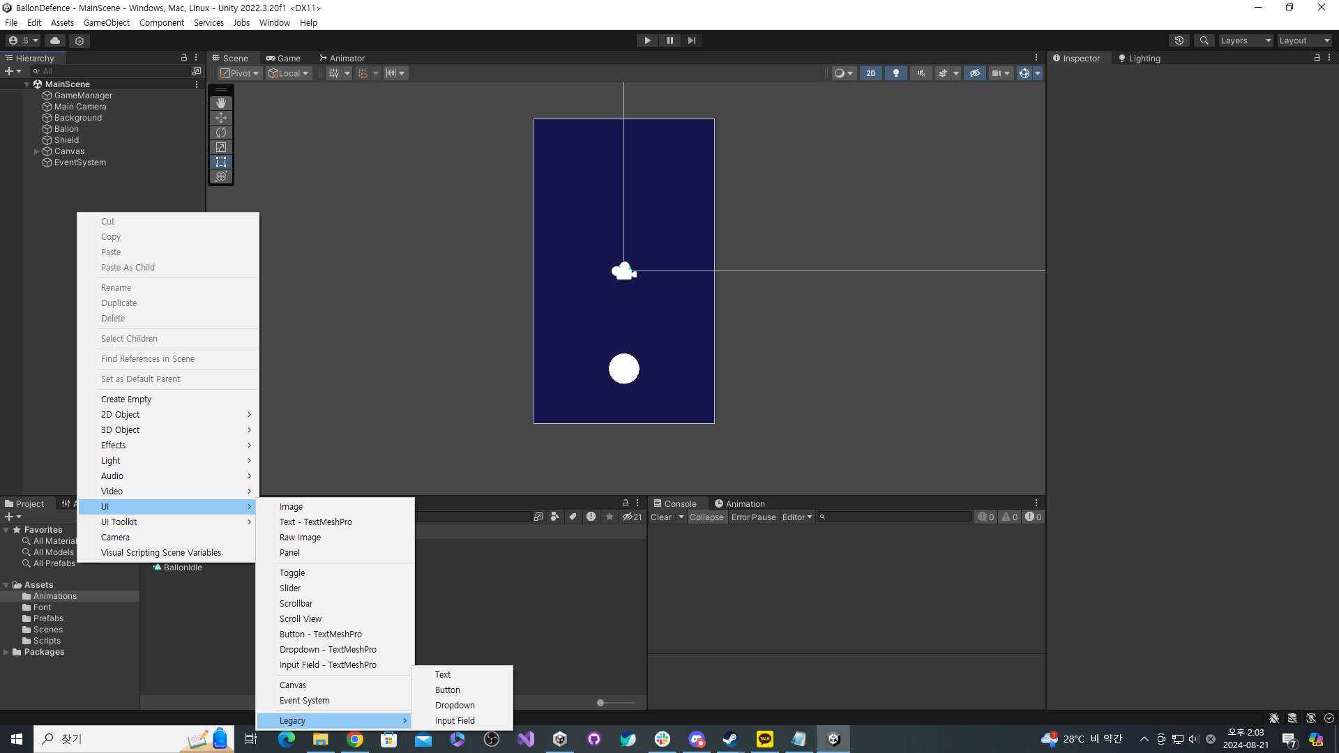 강의 진행중, UI를 만들며 게임에 텍스트를 넣기 위해 UI - Lagacy - Text 를 상용해 텍스트를 넣는것을 볼 수 있습니다.
