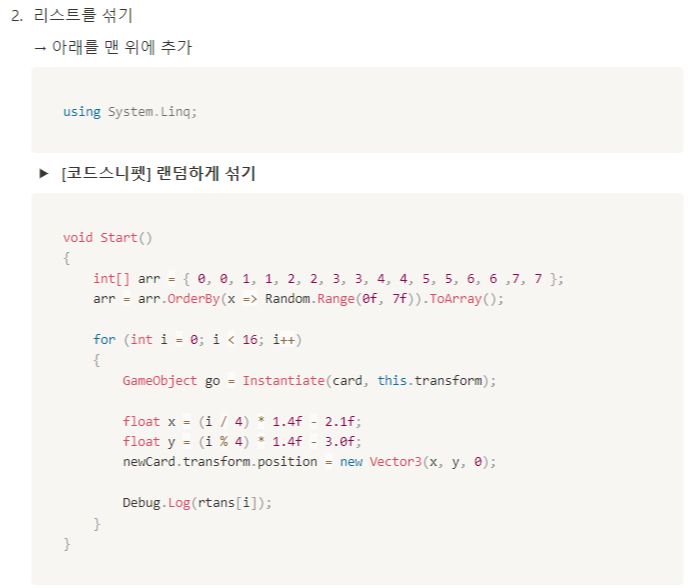 4주차 강의중, Linq의 OrderBy 를 사용하여 무작위로 카드를 배치하는것을 볼 수 있습니다.