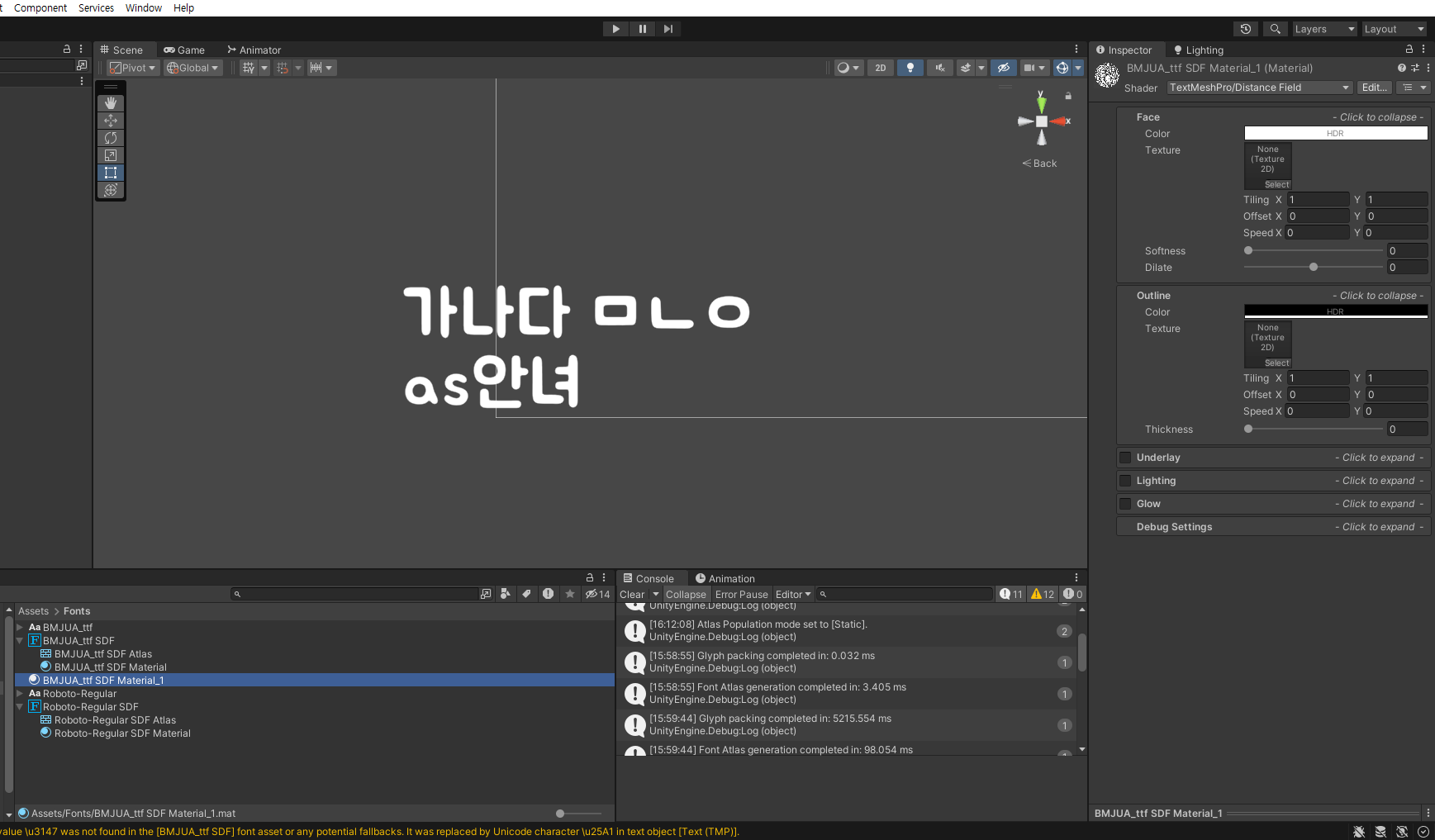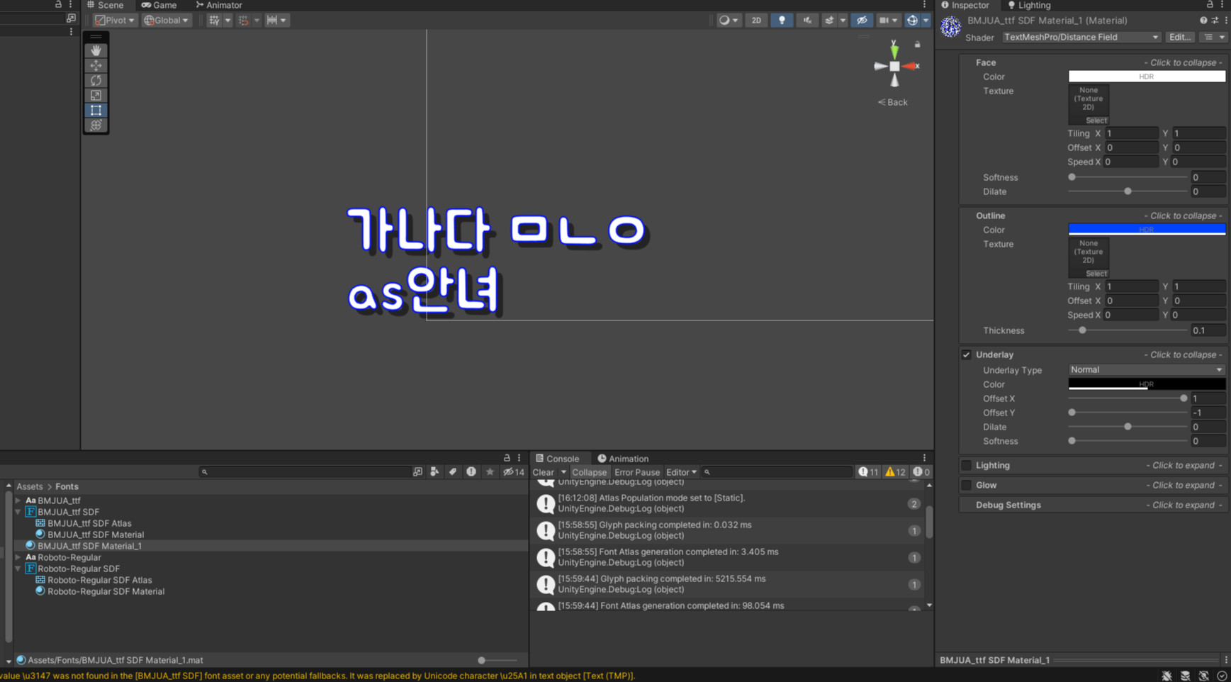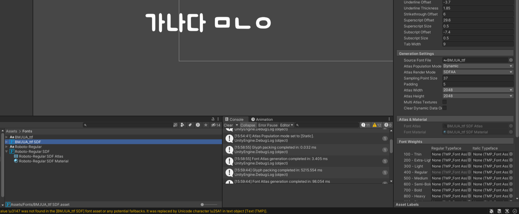 또한 에디터에서만 폰트를 추가하는것이기 때문에, 빌드한 게임에서는 에디터에서 사용하지 않은 글자 사용시, 폰트가 깨지게 됩니다.