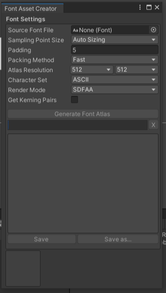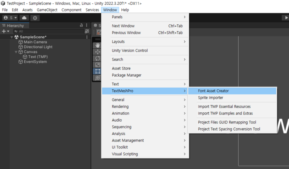 상단 도구모음에서 Window - TextMeshPro - Font Asset Creator 를 누르면 폰트를 TMP에서 사용할 수 있게 변환해주는 창이 나옵니다.