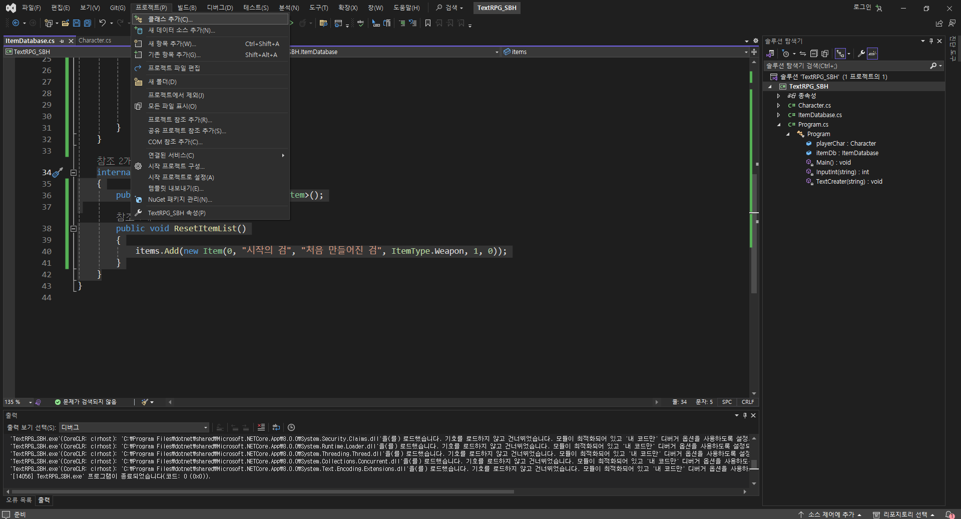 프로젝트 탭에서 클래스 추가를 누르면 메인 클래스임 Program과 별개로 다른 클래스를 만들 수 있습니다.