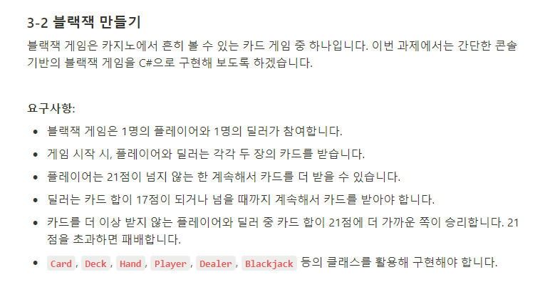 카드 관련 코드는 모두 구현되어있는상태이기 때문에 실제로 구현해야하는 내용은 플레이어 클래스를 상속받은 딜러클래스의 추가 내용과 블랙잭 게임 플레이입니다.