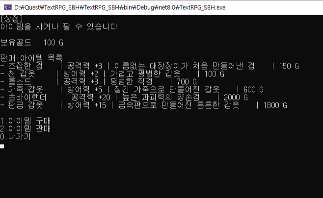 이후 해당 내용을 다시 표기하여 돈과 상점 상태를 업데이트해주며, 1 ~ 6 이외의 입력시 이전화면인 상점기능 선택화면으로 돌아갑니다.