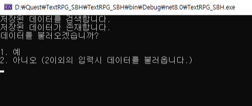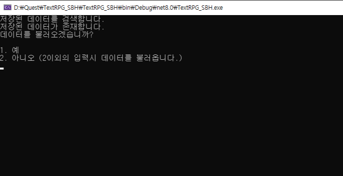 데이터를 불러오는데 성공했을경우 데이터를 불러와서 게임을 시작할지, 새로운 게임을 시작할지 선택지가 발생하고 불러오기를 선택하면 캐릭터 생성을 위한 반복문을 실행하지 않습니다.