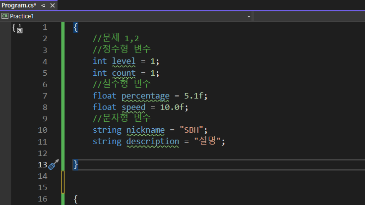 - percentage , speed 의 이름을 가진 실수형 변수를 만들어주세요.
