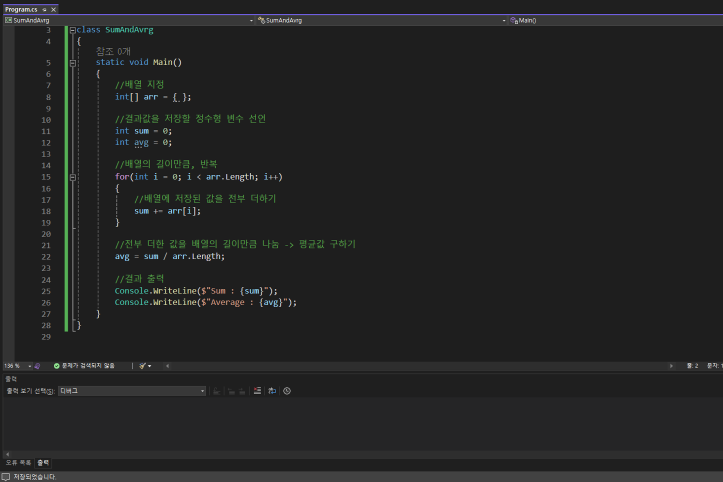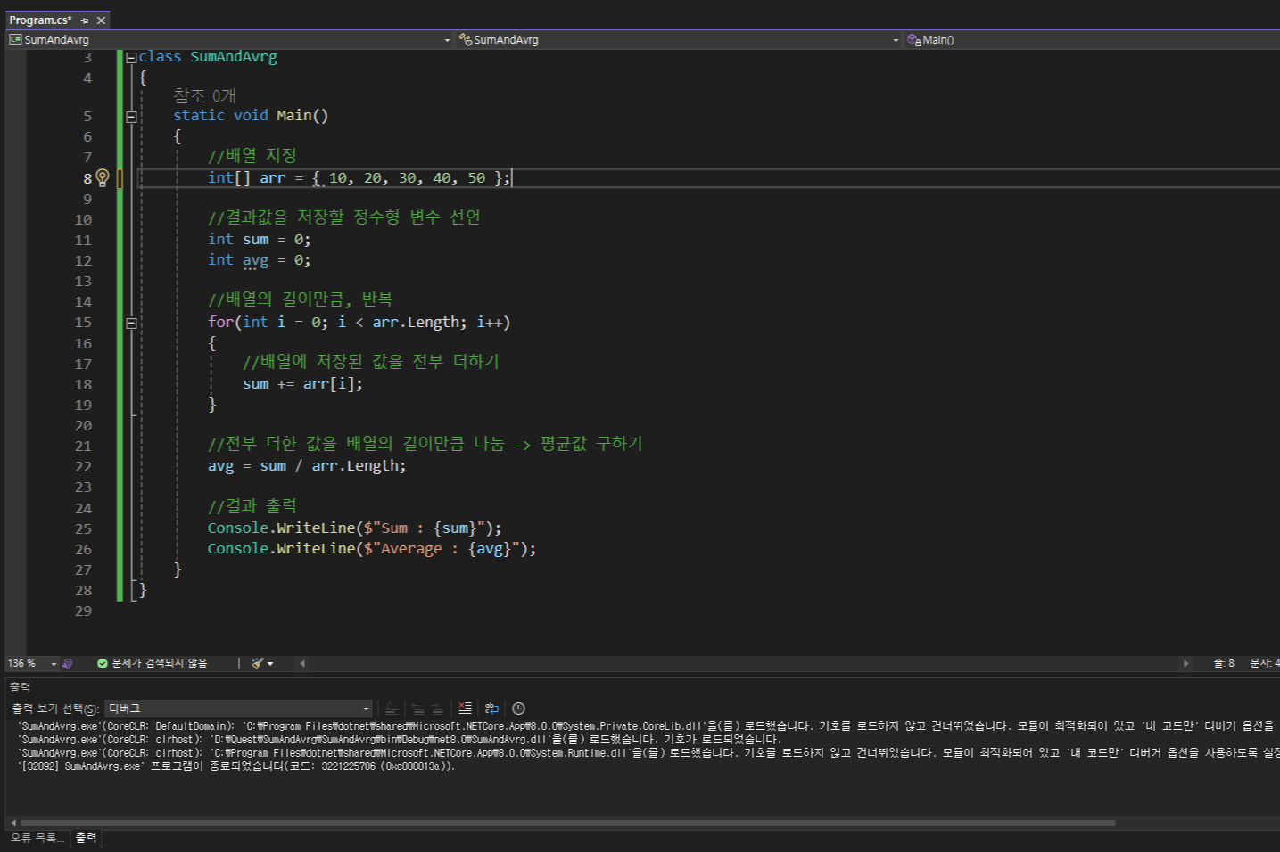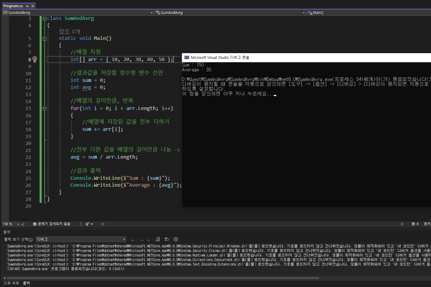 예상값인 합 150, 평균 30이 정상적으로 출력되었습니다