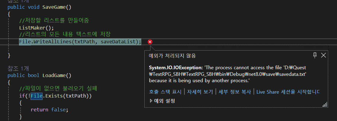 게임을 불러오는데 성공한 후, 게임을 저장하려는데 저장이 안되고 프로그램이 멈추는 문제가 발생했습니다.
