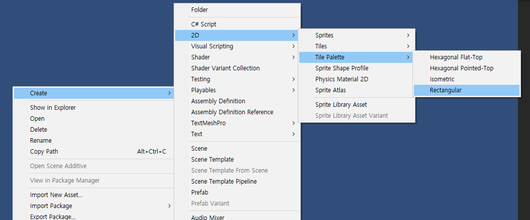 폴더에서 우클릭후, Create - 2D - Tile Palette - Rectangular 를 선택하여 정사각형 형태의 타일 팔레트를 만들어줍니다.