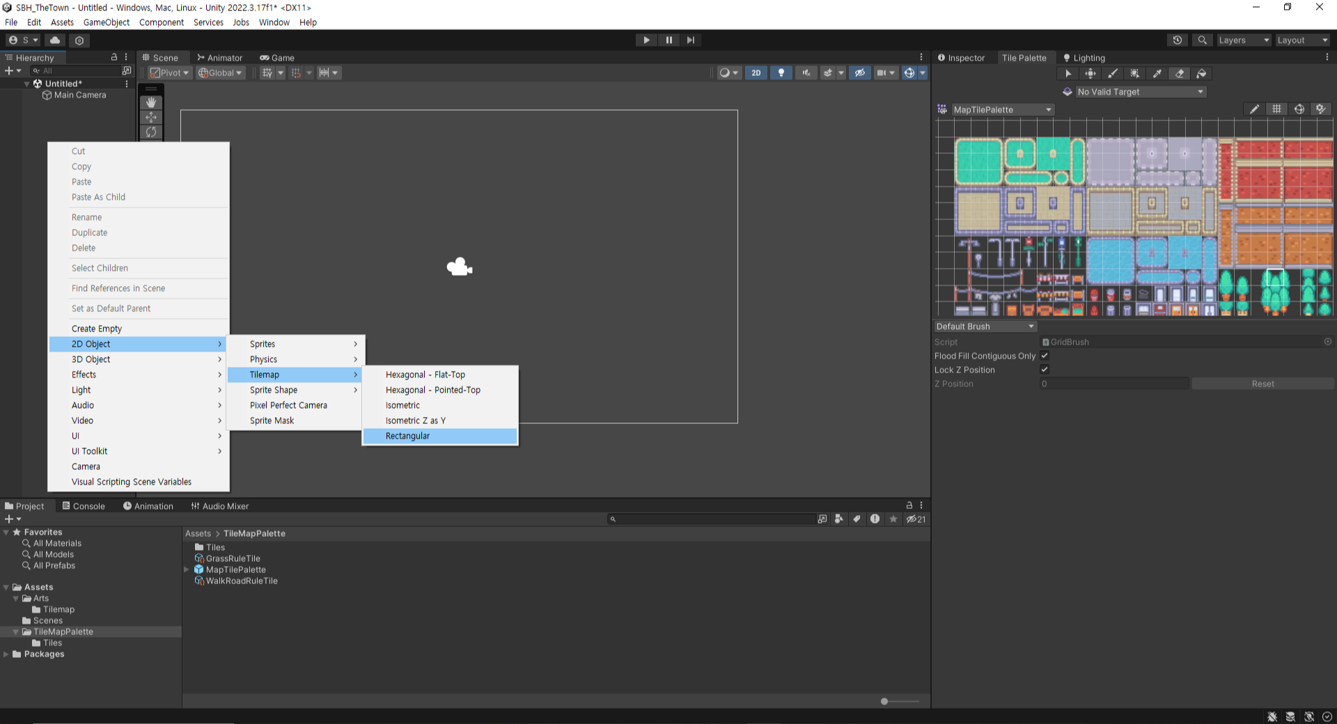인스펙터창에서 2D Object - Tilemap - Rectangular 를 선택하여 타일맵을 사용할 오브젝트를 만들어줍니다.