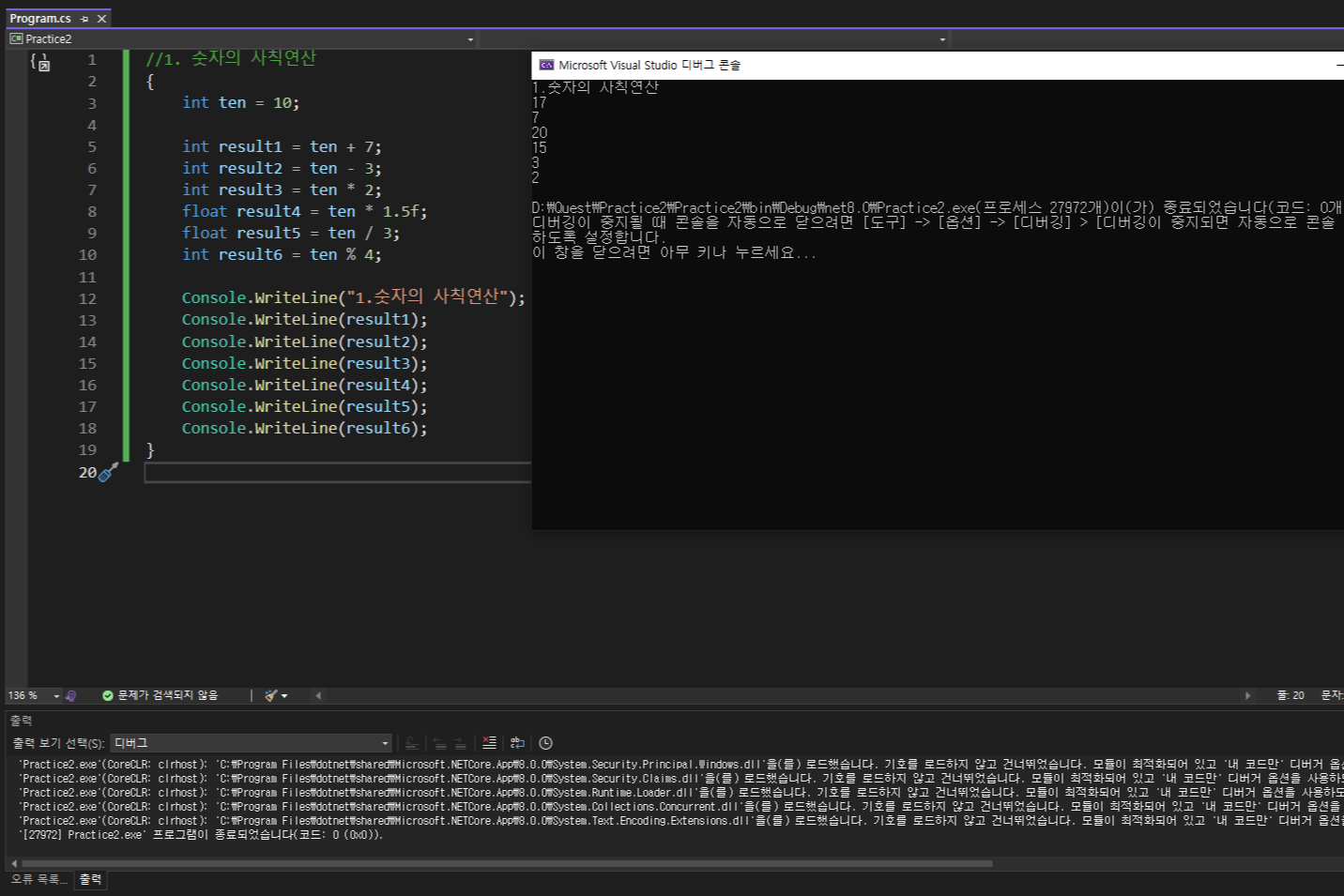 - ten 이라는 변수를 각각의 사칙 연산을 적용하여 각각 변수에 저장한 후 출력해주세요.