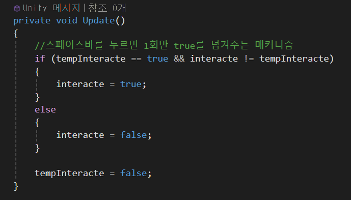 상호작용 입력인 스페이스바 입력을 임시로 tempInteracte 변수에 받아준 상태입니다.