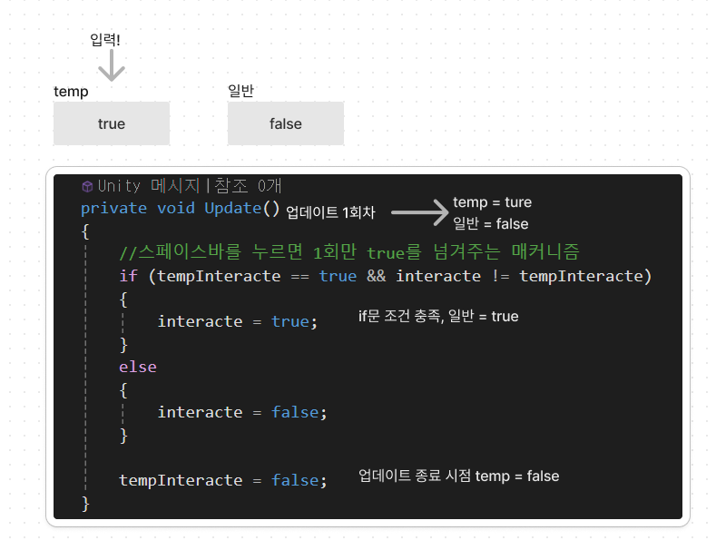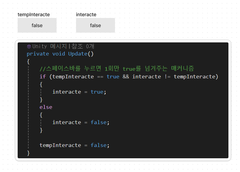 이처럼 입력을 받은 2회차 업데이트 1프레임동안만 interacte 변수가 true로 유지되고 이후 프레임에서는 다시 false가 되면서 외부에서는 1회만 true코드가 작동하게 되는 원리입니다.