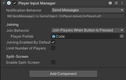 현재 Player Input Manager에 PlayerInput를 컴포넌트로 가지고 있는 Cube 프리팹을 등록해준 상태입니다.