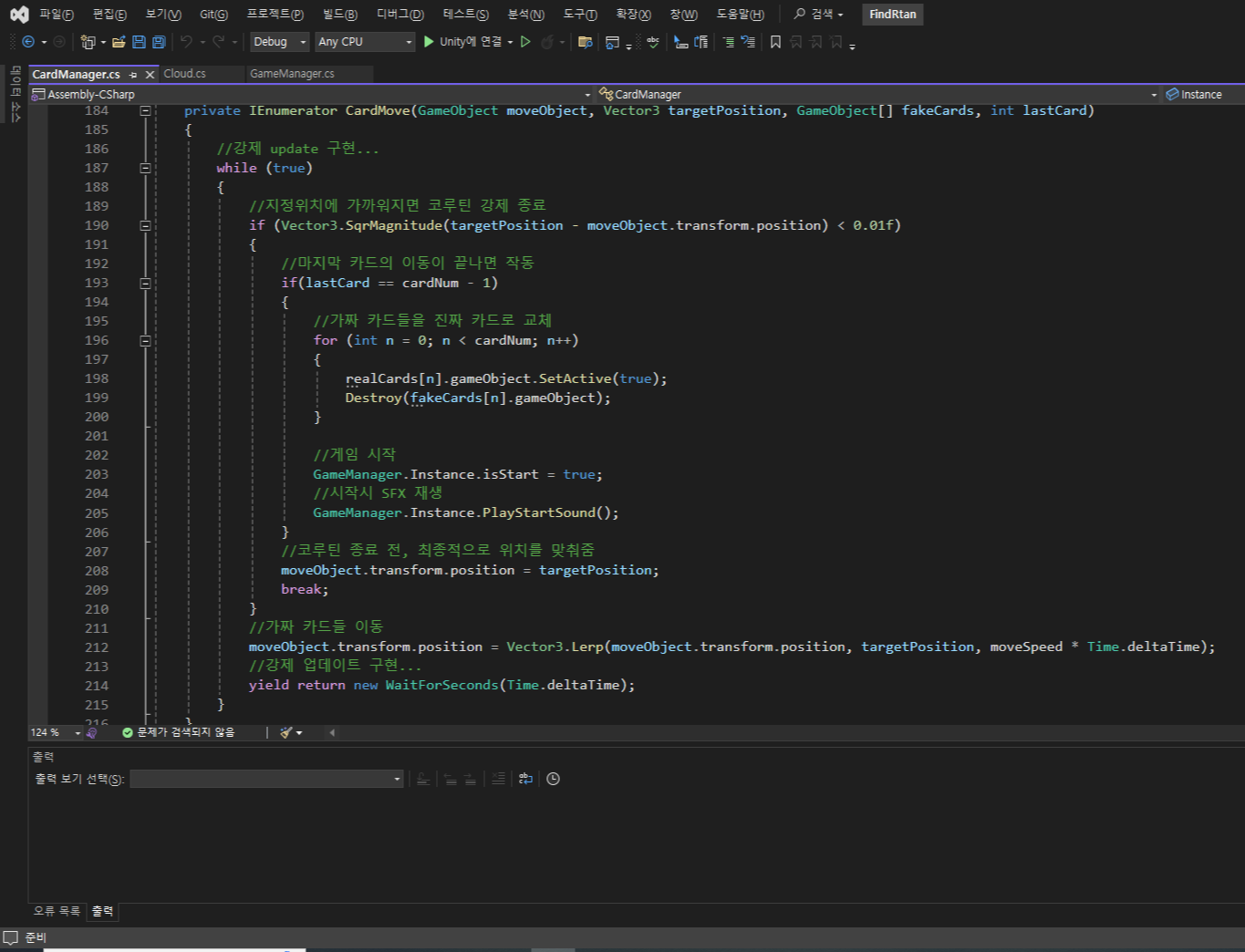 오늘은 금요일까지 제출하는 미니프로젝트, 카드 맞추기 게임을 제작하는데 대부분의 시간을 투자하여 추가로 배웠다던가 하는점이 딱히 없기 때문에 구현 기능중 하나인 게임시작시 카드배치를 어떻게 했는가에 대해 적어보겠습니다. private IEnumerator CardMove(GameObject moveObject, Vector3 targetPosition, GameObject[] fakeCards, int lastCard){ //강제 update 구현... while (true) { //지정위치에 가까워지면 코루틴 강제 종료 if (Vector3.SqrMagnitude(targetPosition - moveObject.transform.position) 특이한점이 ..
