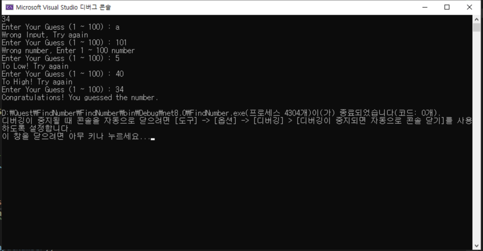 마지막줄에서, 출력된 무작위 숫자와 같은 값을 입력하여 반복이 끝나고 프로그램이 종료된것을 볼 수 있습니다.