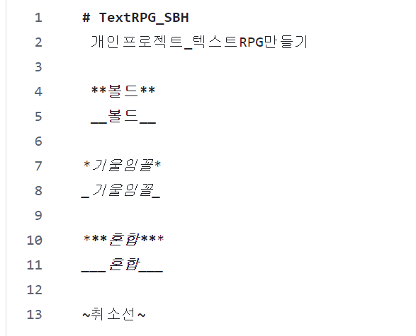 * , _ 를 사용하여 텍스트에 강조효과를 줄 수 있습니다. 사용시 띄어쓰기를 하지 않고 내용을 감싸서 사용할 수 있습니다.