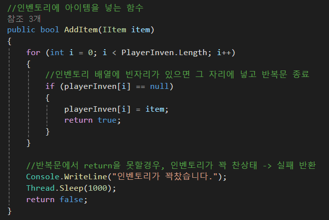 인벤토리에서는 아이템 정보를 받고, 받아준 아이템을 인벤토리 배열에 추가하게 됩니다.
