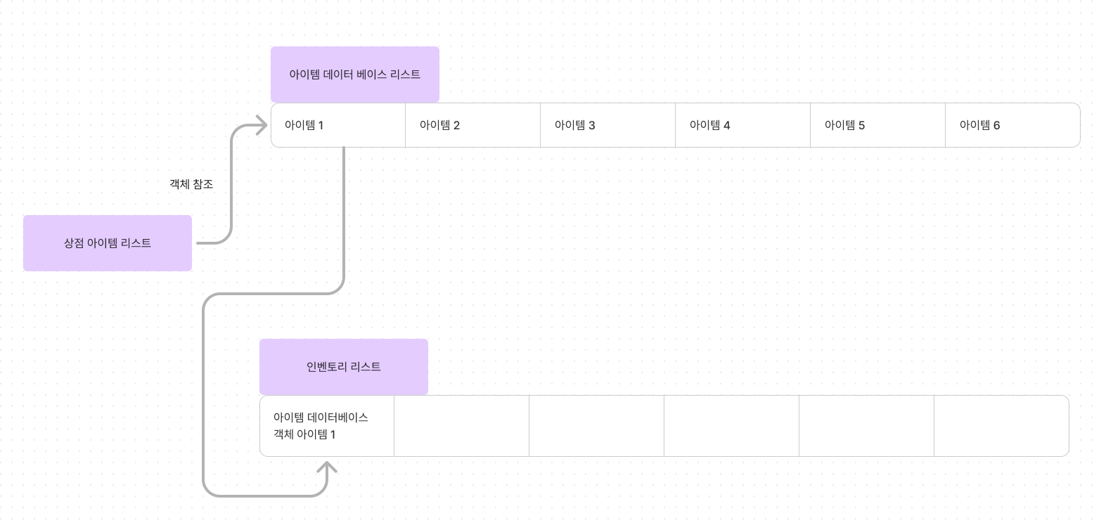 상점의 아이템 정보는 아이템 데이터베이스 클래스에서 생성된 객체를 참조하고, 상점은 이 객체를 참조하여 자신의 판매 아이템 리스트에 저장하게 됩니다.