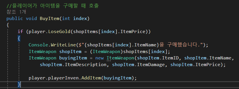 상점에서 아이템을 구매하면 인벤토리 클래스에서 AddItem 함수를 호출하고, 상점 아이템의 정보를 넘겨줍니다.